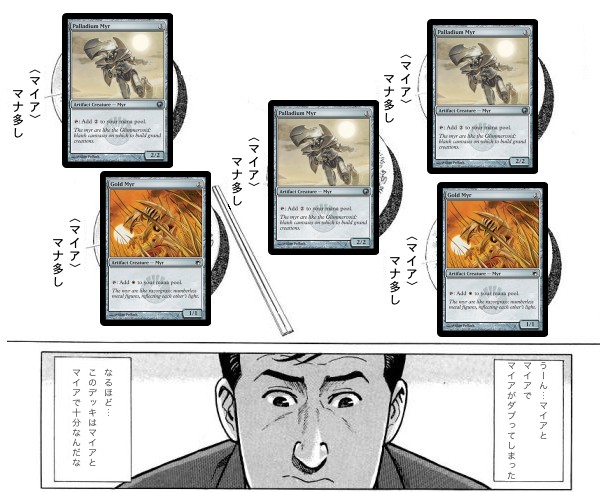 ピック順 【Alessi】→【Sangriter】→【Mei】→【Thraxi】→【Serra】 どうも、僕です。最近は確実に週一のペースでドラフトが出来るのは喜ばしいのですが、構築のデッキばかり組んでなかなか試合に出られていないのでフラストレーションが溜まっています。……なかなか包囲戦で欲しいカードに巡り会えないからさぁ……でも、ボチボチ公式戦出たい。いっそフライデーを飛び越えて日本選手権予選とかに出てやろうかとすら思っている今日この頃。 そうそう、ちょっと前に新エキスパンションの名前が決まってましたな。「イニストラード」。またミラディンとはガラッと変わった、なかなか悪くない雰囲気。イラストの女性はひょっとしてリリアナ姉さんでしょうか。ようやく新リリアナが登場するのかしら? え、ガラクは? マローがリーダーなのは相変わらずだけど、どさくさに紛れてデザインチームにリチャード・ガーフィールドがいるのがすげぇ気になる。 AL SE TH SA NC AL ー ◎ ◎ ◎ ◎ 4ー0 1 SE × ー × × ◎ 1ー3 3 TH × ○ ー ◎ ◎ 3ー1 2 SA × ○ × ー × 1ー3 5 NC × × × ○ ー 1ー3 4 1位 【Alessi】 赤白 <飛行機械の組立工 感電破 存在の破棄> 前回のデータ一覧スペシャルで「勝率は悪くないのに優勝回数が少ないでやんのpgr」とか書いたら、すぐに完全優勝とかしやがる。あなたのそういうところがキライなのよ! さておき、赤白なので当然のボロスビート形式なのだが、今回は赤が妙に不人気。というのも、後述するが普段白金属術寄りの人間がごっそり感染に移住したために、こちらのカラーががら空きになり、かなりダラダラと取り放題になったのだ。おかげで1パック目の恩恵は大きく、「不純の焼き払い」が4引き、「カルドーサの炎魔」が5引き。さらに「カルドーサの炎魔」「カルドーサの再誕」とのシナジーを発揮する「胆液の水源」がかなり遅めに2枚確保出来ている。クリーチャーは低めのマナ域がそこまで優秀なわけではないのだが、火力や「迫撃鞘」でいなしつつ「カルドーサの首謀者」や「飛行機械の組立工」に繋ぐスタイルが綺麗に回っていた。そして、今回のMVPは文句無しで「知性の爆発」。全体に3点、4点、5点とたたき込むアドバンテージの塊が10引きっていうのは、冷静に考えればおかしな話である。みんな、自分の運をナメ過ぎなのかもしれない。ひどいものを見た。 2位 【Thraxi】 白緑 <皮羽根 先駆のゴーレム 鍛えられた鋼> 2週続けてのまっすぐな白緑。これは偶々でもなければ意志のあるピックでもない。実は「真鍮の従者」が華麗に動くところを見てみたい、という訳の分からない願望があって、先週もやたら早く引いたし、今回はなんと2引き。そのため、「装備品を多く引きたいな」と思うと、多少無理矢理でも序盤に白に渡りを付ける必要が出てきて、結果的にこの形になるのである。また、今回は「暴走の先導」が引けたので、「もう、クリーチャーだけひたすら引き続ければいいんじゃないかな」という単純な指針となり、気づけばデッキの8割がクリーチャーというデッキ構成に。「鍛えられた鋼」なんておまけも引けたし、適当に並べとけば勝てるだろ、の精神である。ただ、流石にカードが被りすぎ。「パラジウムのマイア」×3に「金のマイア」×2。言うなればこんな状態である。「腐食獣」も4枚あり、最初は「マイア全種、腐食獣2枚」というスタイルにしていたのだが、「マナ出過ぎ」ということで、最終的には「パラジウムのマイア」が1枚抜けて「腐食獣」は4枚全部突っ込まれることになった。荒れ狂うトランプルの嵐。ひどいことをした。 3位 【Serra】 緑黒 <ヴィリジアンの堕落者 テル=ジラードの堕ちたる者 疫病のとげ刺し> 実に珍しく、この男が感染へと動いた。その1引きは「ヴィリジアンの堕落者」だ。そこから「腐敗狼」×2「墨蛾の生息地」など安定した感染基盤を整えていくが、2パック目で登場した「飲み込む金屑ワーム」が一周してきたので、流石にこれもキープ。「吠える絡みワーム」もおり、謎のワームコンビがフツーに緑ビートをおりなすシーンも。結果的にはややライフ30点の趣。その結果、2人で分け合った感染としてのレベルはそこそこになっていると思うのだが、やはり上2人のデッキとはレベルが1段違うものになってしまい、単に並べているだけではボコられることに。「病気の拡散」10引きとかいう訳の分からないことが起こったんだから、いけると思うのが普通だけどな。これだから包囲戦1パック目の罠は恐ろしい。 4位 【Mei】 緑黒 <ヴィリジアンの堕落者 転倒の磁石 大建築家> そして、こちらも実に珍しく感染デッキへのルートを辿った。そのスタート地点は、やっぱり「ヴィリジアンの堕落者」。罪なカードである。普段感染をやらない人間、とはいっても、単に感染と書いてあるカードを集める簡単なお仕事なわけだが、それでもどこかピントがずれるピックというのはあり、上述のように「病気の拡散」をかなり遅めで流してしまっている