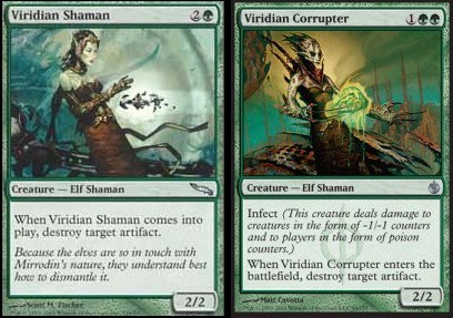 <緑・多色> Blightwidow 荒廃後家蜘蛛 (3)(G) C クリーチャー・蜘蛛 2/4 到達 感染 マジックの礎を支え続ける、たった2枚だけ残された「皆勤賞」カードの1つ、「大蜘蛛」。絶滅をかけた壮絶な戦いを勝ち抜いてきたタフネス4の安定感抜群ボディは、いつだって蜘蛛の大切さを僕たちに教えてくれる。M11になって全く同じコストなのに空を飛んでいる「蒼穹のドレイク」が出てきてるんだけど、負けちゃ駄目だ。そして、そんな蜘蛛へのご褒美として、全く同じ設定で感染だけをプラスしたミラディン仕様の蜘蛛が開発された。感染ダメージは必ずしも純粋なメリットではないと言いつつも、パワー2の感染ならなかなか本体には通したくないし、なんと言っても蜘蛛の本懐はブロックにある。ブロッカーとして立ちはだかった時の感染の面倒くささたるや、パワー4を誇った「針先の蜘蛛(PLC)」もびっくりである。3/3クラスの普通のクリーチャーで攻めにくくなるだけでも充分だし、このスペックがコモンで手に入るというのは、感染デッキには相当なプラスに違いない。マジでどうやって突破すればいいんだろうね。 Creeping Corrosion 忍び寄る腐食 (2)(G)(G) R ソーサリー 全てのアーティファクトを破壊する。 あの「粉砕の嵐(10ED)」が色とレアリティを変えての復帰。今の世界ではアンチアーティファクトは赤よりも緑の分野ということになったか。まぁ、「自然に帰れ」と並べると、「緑はクリーチャーに対処出来ない代わりに他のパーマネントに強い」という特性は良く出ているのではなかろうか。これで赤がちゃんと土地破壊の仕事を得意にしてくれてればいいのだが……さておき、リミテッドなら当然ラスゴ級。緑ユーザーだったら白や赤ほどアーティファクトを並べる必要も無く、ひょっとしたらラスゴよりも自軍有利の状態を作りやすくなるかもしれない。1パック目で引いてしまえば、アーティファクト薄めの感染あたりに持っていくのも難しいことではなさそうだ。構築戦でもアーティファクトの今後の拡大を考えれば充分有用な候補カードにはなると思うが、現時点でそこまで依存度の高いデッキは見あたらないので、今後のメタ次第といったところか。ま、「メムナイト」や「羽ばたき飛行機械」を壊してもそんなに嬉しくないけどな。 Fangren Marauder ファングレンの匪賊 (5)(G) C クリーチャー・ビースト 5/5 いずれかのアーティファクトが戦場から墓地に置かれるたび、あなたは5点のライフを得てもよい。 「ファングレンの狩人(MRD)」などでお馴染み(?)のミラディン原産ビースト、ファングレン。地味に「絡み森の脈動(DKS)」で出てくるビーストトークンもファングレンだぞ。で、そんな新作ファングレンだが、我らが緑の代名詞にして最強最大のクリーチャーであった「最上位のティラナックス」様が、色拘束を緩くしたせいでパワーを1下げてしまったもの。「なんだぁ、6マナでパワー6無いなんて、ケツ拭く紙にもならねぇじゃん!」とお悩みのティラナックス派のあなた。安心してほしい、多分ライフアドバンテージで言ったら勝負にすらならない。アーティファクトクリーチャーを2体ほどチャンプブロックさせれば10点ゲイン。そのどさくさに紛れて「真っ二つ」でも使っとけばさらに5点。別に相手のカードじゃなくてもいいので、大量の「地平線の呪文爆弾」を連打すれば一気に20点ゲインとかもあり。ちょっと油断すれば40点越えも見える。何コレ。5点は流石に考え無しすぎやしないか? みんなで「カルドーサの鍛冶場主」と一緒に使おう。もちろん、「ライフゲインなんて男のすることじゃねぇよ!」という人は、今まで通りに「ティラナックス」様を愛でるがよかろう。感染相手なら意味ないからね! Glissa’s Courier グリッサの急使 (1)(G)(G) C クリーチャー・ホラー 2/3 山渡り 赤の「コスの急使」と対になった存在だが、コスの部下がおっぱいボインな女の子だったのに対し、裏切り腐敗したグリッサの部下はみるもおぞましいホラーである。一体どこで差が付いてしまったのか……慢心、環境の違い。いや、マジで環境の違いだけども。ちなみに「コスの急使」は赤単で初めての森渡りクリーチャーであるとお伝えしたが、こちらの急使さんも、緑では初めての山渡り持ちである。お互い初めてどうし、仲良くやればいいよ、って言おうとしたけど絶対にすれ違うんだな。ちなみに赤以外に過去に登場した山渡り持ちは、白が2体で「崖を縫う者」と「丘漁りの巨人(LRW)」。また、意外なことに青のマーフォークにも1体おり、「River Merfolk(FEM)」という、名前からするとどう考えても山は渡れそうもないクリーチャーが過去に存在していたようだ。またどうでも良い知識が1つ増えましたね。 Green Sun’s Zenith 緑の太陽の頂点 (X)(G) R ソーサリー あなたのライブラリから、点数で見たマナコストがX以下のクリーチャー・カードを1枚探し、それを戦場に出す。その後、あなたのライブラリに〜を加えて切り直す。 Zenithサイクルの緑。