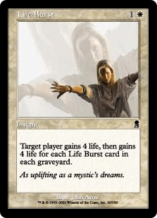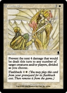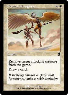 「エイヴンの群れ/Aven Flock」。のちに基本セットにも収録されることになる、超超普通のコモンクリーチャー。5マナでパワー2しかないのでリミテッドでもそこまで強いわけじゃないカードなんだが……でも、僕らの中でオデッセイって、こういう環境なんだよ。こいつを筆頭にしたとにかく後ろ向きな白デッキが、信じられないくらい固かったんだ。他のメンバーとしては、序盤でも2点の軽減をばら撒き戦闘を掌握し、スレッショルドしようものなら4点軽減とかわけのわからないことを言い出す「尊い癒し手」。行って4点、帰りも4点を分割軽減してしまうハイスペックすぎるフラッシュバック「励まし」。4点→12点→24点?!と回復していく「生命の噴出」。そしてとどめはどんなアタッカーでもアド取りながら消し去ってしまう「考え直し」。