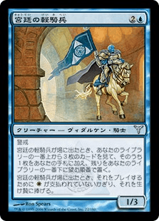 ○第22回 伝説は死してなおレギュレーションに名を刻む(ディセンション) ラストエキスパンション強いの法則はあるものの、このラヴニカ世界ではちょっとばかり事情が違う。「最後」には違いないが、あくまでも「10のギルドの残り3つ」であり、ここだけ露骨に強くなってしまったら他のギルドに怒られる。まぁ、最初の4つに比べたら登場が半年も遅く、環境で使える期間も短いのだから多少優遇されてもいいのかもしれないが……幸か不幸か、特にそんな印象もないのがこのディセンション。結果的には、「触れた期間が短くて剥いたパックの数も少ないので印象は薄い」というのが正直なところ。そう考えると、諸々の問題を解決するために現在の1セット1ブロック制になったのも致し方なしか。 さて、残された3つのギルドはアゾリウス・ラクドス・シミックの3つ。このうち、アゾリウスは明らかにコントロール寄りのギルドであり、ラクドスは攻め気の強い速いギルドになることは確定していた。歴史を振り返ってみても、白青の2色で組めばそれはコントロールを意味し、昔ながらの「壁で守って空で勝つ」方向性も顕在。「まぁ、そうなるよね」というカードが色々と開発され、「糾弾」や「宮廷の軽騎兵」などが環境では活躍した。