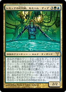 「シミックの幻想家、モミール・ヴィグ/Momir Vig, Simic Visionary」である。いや、ぶっちゃけこのカード自体はほとんど世間的には活躍していない。しかし、彼ほど奇妙な理由で有名になった伝説のクリーチャーは他にいないだろう。そう、ご存じの方も多い「モミールベーシック」の存在。時代が進み、ネットのデータ上でMagicが出来るようになったことで産み出された、狂気の産物としか思えに新たなフォーマット。本人も予想してなかったところで、彼の名前は歴史に名を刻むことになったのである。後にも先にも、1つのフォーマットの中に名前を残したクリーチャーってのは彼くらいのものである(まぁ、「双頭巨人」っていうのもいることはいるが、あれはフォーマットの後にクリーチャーが誕生してるから)。 こうしてモミールさんがヘンテコフォーマットの顔として使われるようになった理由は、厳密にいえばアバターが云々という細かい話になるわけだが、それ以上に、クリーチャーをとんでもない方法で産み出すなら、やっぱりシミックに任せるべきだ」という1つの「シミック像」が完成したことによるのではなかろうか。イゼットは青を起点としたインスタント・ソーサリーの専門家。そしてシミックは、青に片足を突っ込みながらもクリーチャーの専門家。これだけはっきりとしたフレーバーを盛り込めたことが、この「ディセンション」における最も大きな歴史の一歩だったと言えるだろう。また、このシミックが「移植」というキーワードを生み出したおかげで、その後の緑青の組み合わせには、あらたに「+1/+1カウンター大好き集団」という特性も与えられることになり、イクサランマーフォークのような一部のコンセプトが固まっていくことになるのだから、彼らの業績はラヴニカを飛び出して多元宇宙の全土の渡っているのである。 ちなみにこの当時から、何故かシミック連中は両生類が好きでな……このこだわりはなんなんだろう。新しいラヴニカではすっかりこのイカレ具合が突き抜けて、「クリーチャータイプ大喜利をやる連中」みたいなイメージになってしまったが……。