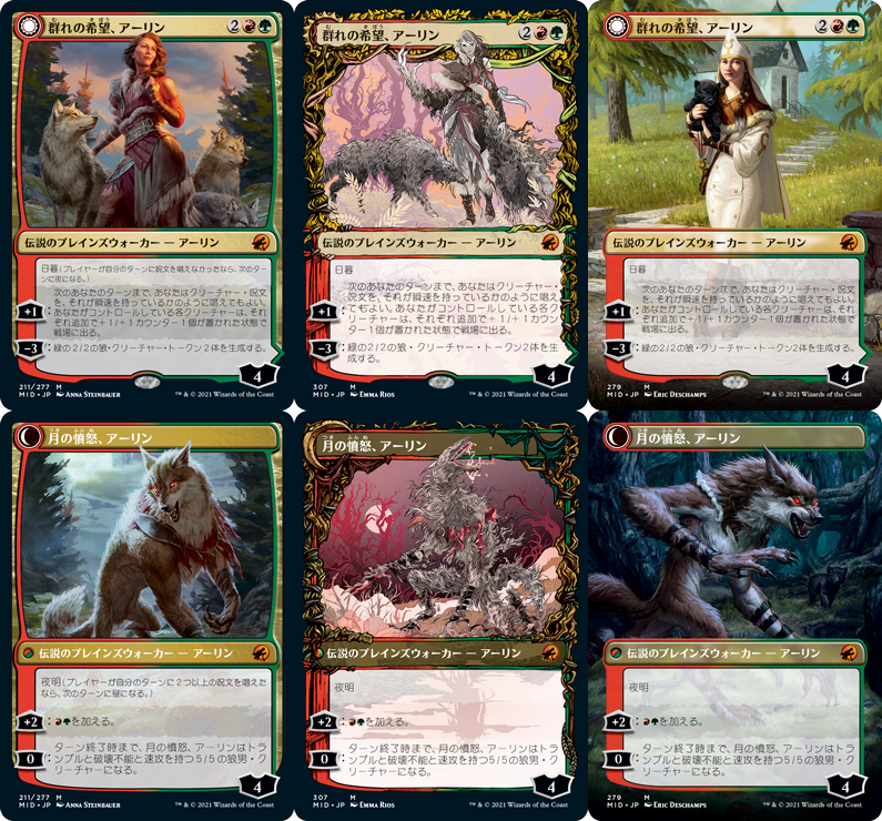 伝染病の狼/Pestilent Wolf ちょい重い接死付与能力を持つ狼。2マナ2/2だけだとやや物足りず、起動コストも重いのであんまり使いたくはないのだが、まぁ、狼デッキなら自分のターンに呪文を唱えずに能力を起動するのもそこまで心が痛まない可能性はあるか。でも、もう1マナくらい軽くしてもよかったんじゃ? 格闘系呪文との兼ね合いなんかなぁ。 うなる狼/Snarling Wolf マッドネスを失った「日を浴びるルートワラ」。こうして起動型能力でパンプする狼はイニストラードでは定番で、過去にもこれの「ルートワラ」バージョンである「暗茂みの狼」や、パワーの増強のみ可能な赤の「残忍な峰狼」などが存在している。当然こうしたデザインは狼男の「夜にしたいけど自分のターンにマナが余ってもったいないやろ」というお悩みに対処するための手段である。でもまぁ、どうせ1回しか起動できないし、狼シナジーを狙わない限りはそこまで慌てて引くようなクリーチャーではなさそう。 群れの希望、アーリン/Arlinn, the Pack’s Hope ↓ 月の憤怒、アーリン/Arlinn, the Moon’s Fury さてアーリンだ。イニストラードは彼女の故郷。その故郷に危機が迫っているとなれば、そして今回が狼男セットだというのであれば、間違いなく彼女の出番である。アーリンの登場は「イニストラードを覆う影」の時なのでそれなりに過去ではあるのだが、どうも彼女は前に出てくる性格ではないようで、その後のカード化も灯争大戦のアンコモン1枚きり。神話で、変身能力を持つ「アーリンらしい」アーリンはようやく2枚目ということになる。 変身能力が絡むPWってのは色々と調整が難しく、能力が多くなるのでコワレ性能にならないように注意しなきゃいけないし、いかに変身ギミックを個性として混ぜ込むかも工夫のしがいがある部分。今回は昼夜システムがあるのでその部分で悩む必要はなくなったが、このシステムは大抵「自分のターンが終わった時に夜になる」というパターンが多いわけで、裏面を活用するギミックの作り方はなかなか難しい。表も裏も「マナを出す」とか「クリーチャーを出したら」とか呪文を唱えることを推奨する能力になっているので、夜の静けさを維持するのが結構難しいってのも考えどころだ。まぁ、想定されているデザインとしては、夜の状態で忠誠度を伸ばして昼のうちに仲間を増やせ、ということなのだろうけども。 他のカードが絡まないと成立しないカードなのでなかなか現時点での評価は難しい。一番輝くのはやはりコンセプトが統一された人狼デッキなのだと思うが、何か大きく評価が上がるようなデッキが誕生するだろうか。