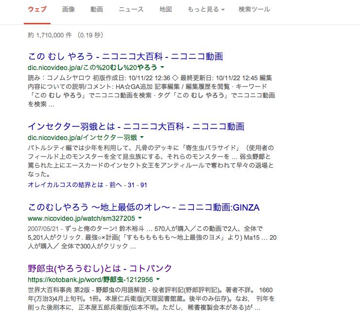 Round5・「やろうむし」 1.現在最古の歌舞伎評判記。1660年刊。著者未詳。 2.狂言。蚊に刺された一兵衛が騒ぎたて、人づてに話が広がるにつれて、最終的に辻斬りに斬られたことになり、後に真実を知った町人たちに虫野郎と罵られた。 3.下卑た男の魂が暴走し、外に出たもの。 4.想像上の虫。乱暴、狼藉を働くのはこの虫が体内に入り込んだためであると考えられていた。 5.大勢の男に囲まれて、蒸されるような思いをすること。 ひらがな、クオテーション無しで「やろうむし」をググると、愉快なあの人の名前がヒットします。わろた。 「たほいや譜の更新が全く無い、怠慢である」って怒られたんだけど、世界中探してもこの記事を求めている人間ってあなた1人だけだと思うよ(特定個人に向けて)。