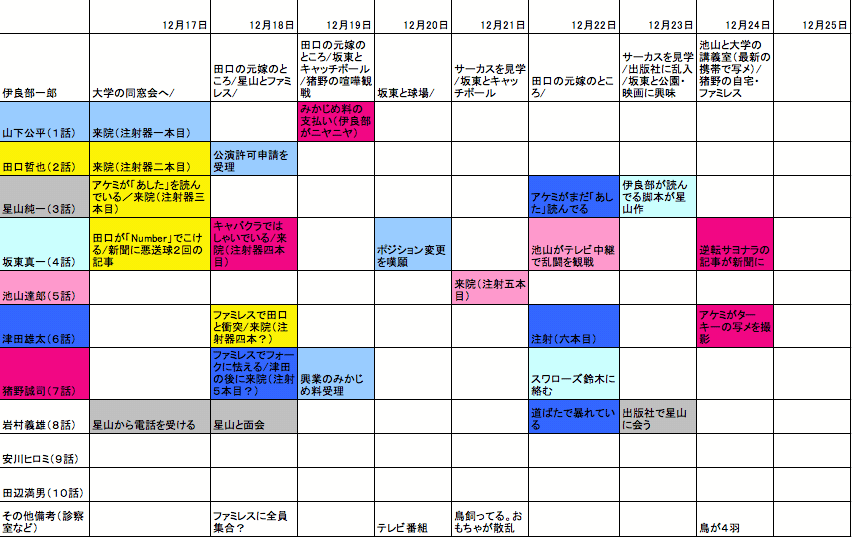 最近「空中ブランコ」で検索来訪してくれる人が増えてて微妙に嬉しい第7話。面白いアニメだと思うのになかなか話題にならんのよね。 今回の主人公は、1話からもちょいちょい出てきていたゴーグルヤクザ、猪野誠司(高橋広樹)。特徴的なゴーグルのおかげで背景にいてもやたらと目立つキャラクターだったが、今回ようやくメインで登場。アバンからいきなりロシアンルーレットによる脅しをかましたりと、なかなか堂に入ったその筋のモノ……と思ったのもつかの間。彼の症状は先端恐怖症。非常に聞き馴染みのあるこの病名だが、実際に重度の症状に悩まされている人間というのはなかなか見たことがなかった。そして、実際に見ると……結構間抜け。そりゃま、誰だった刃物は怖いんだけど、猪野の場合は冒頭に拳銃突きつけて啖呵切ってるだけに、筆記用具や野菜スティックにまで怯える様は非常に滑稽である。注射後の変身がチワワというのも皮肉が効いており、最後には敵対組織のヤッパのヤスと2人してチワワになってきゅんきゅん怯えているのが可愛らしい。 今回の治療は、実は非常に珍しいケースである。というのも、これまでのエピソードにおいて、様々な神経症の「原因」は、およそではあるが根本を提示されいてることが多かった。1話から順に並べると「人見知り」「妻の浮気への鬱憤」「執筆ストレス」「台頭する若手への不安」「秘密をしゃべりたい衝動」「孤独感」。しかし、今回の猪野の先端恐怖症の場合、何故そういった病気になってしまったのかという原因が明示されていない。そのため、今回はラストシーンでも病状が完治したという描写はなく、「そのうち慣れる」というぼんやりした幕引きになってる(最後にケーキにフォークを刺したカットを「治った」と見ることは出来るが)。伊良部の治療も、「逆療法で注射を刺そう」とか「サングラスをすればいい」とか、具体的な割には効果が出ないものが多く、いつものように「気がつくとベストの治療をしてたんだね」みたいな達成感が薄い。 代わりに、「怖がってもいいじゃないの」というある種消極的なメッセージ性みたいなものが伺えるのが今回の新機軸。主人公が刃傷沙汰に関係するヤクザもので、そのヤクザが女から「足を洗えばいい」と再三言われていることから、「刃物が平気でも自慢になんかなりゃしないんだから、苦手なりに生き方を見つけた方がいい」みたいなメッセージが読み込めるのだ。虚勢を張った神経の細いヤクザものよりも、それを尻に敷いてやりくりしている女の方がよっぽど強そうに見えるのは端的な部分である。 今回は猪野のコミカルなキャラクターも相まってテンポのいい演出が見どころとなっており、敵や子分の前で威勢のいい姿を見せながらも、女の前では一人の悩み多き若者になり、刃物を突きつけられれば滑稽なまでに怯え上がる猪野の表情が面白い。女にやり込められると背中の般若がショボンとしたり、「サンマはやめろよぉ!」と飛び上がって逃げたり、ゴーグルを入手してしたり顔でシャーペンを目に近づけてみたりと、中の人の高橋広樹も、実にのびのびとやっていて楽しそうだった。次回はあの岩田光央が登場。どんな素っ頓狂なキャラクターが飛び出すのか、楽しみです。 そうそう、サブイベントの話だが、今回12月24日に猪野が読んでいる新聞に、坂東が逆転サヨナラを演じたという記事が載っている。確か4話では坂東がベンチから声を出しているシーンで終わっていたはずだが、こういうところで別エピソードのエピローグが見られるというのは面白い趣向。そこで、以前からやりたいと思っていた時系列表を簡単にではあるが自作してみた。まだ見てないエピソードもあるので抜けはあるだろうけど、改めて見ると伊良部の激務っぷりが確認出来る。参考までに今週までを載せておこう。横の行が名前の人物に関わるイベントで、セルの色は何話で描かれたかを表している。 PR