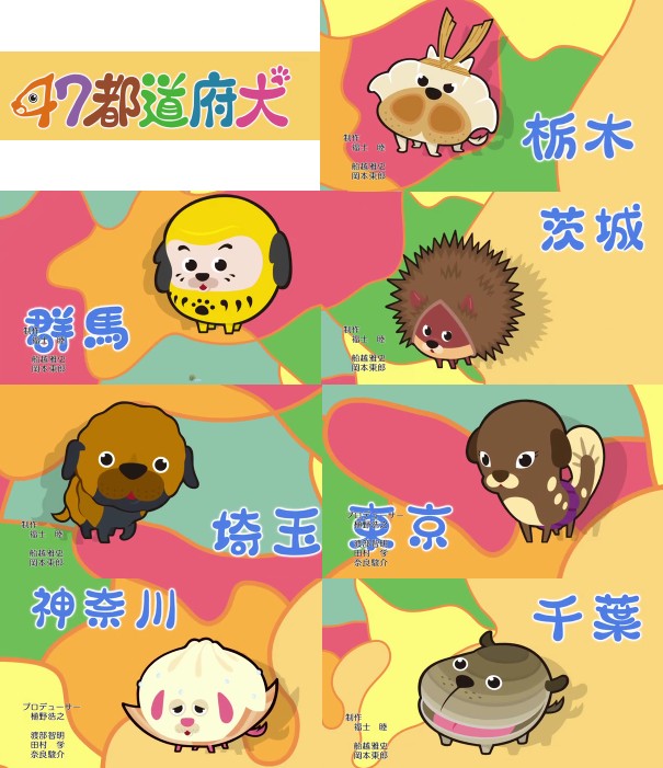 栃木犬=餃子 群馬犬=上州だるま 茨城犬=栗 埼玉犬=草加せんべい 東京犬=ドジョウ(?) 神奈川犬=中華まん 千葉犬=はまぐり(?)
