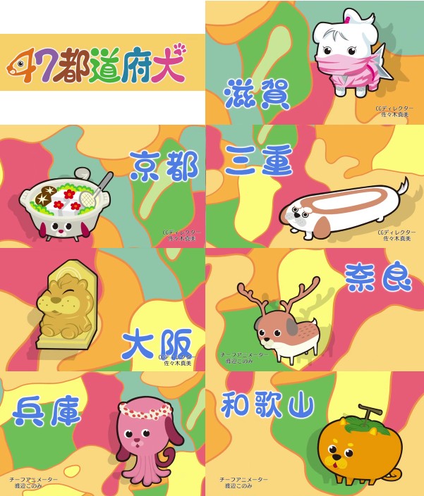 滋賀犬=忍者(?) 京都犬=湯豆腐(?) 三重犬=なが餅 大阪犬=ビリケンさん 奈良犬=鹿 兵庫犬=タコ 和歌山犬=柿