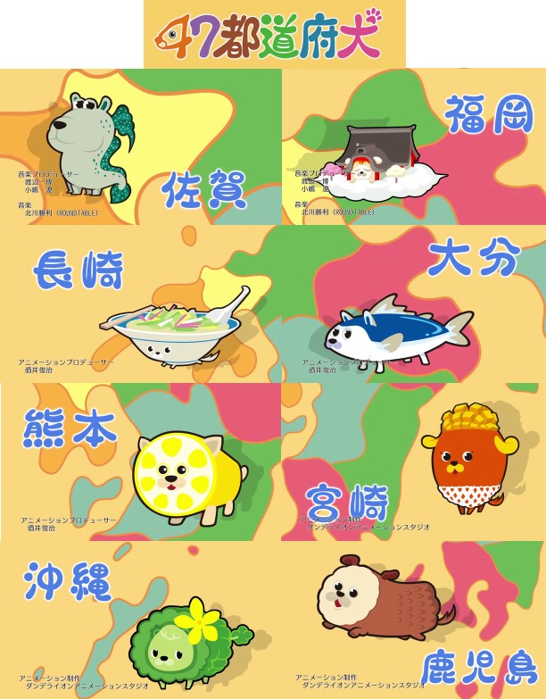 佐賀犬=ムツゴロウ 福岡犬=太宰府天満宮 長崎犬=ちゃんぽん 大分犬=関サバ(?) 熊本犬=れんこん 宮崎犬=マンゴー 沖縄犬=ゴーヤ 鹿児島犬=薩摩揚げ