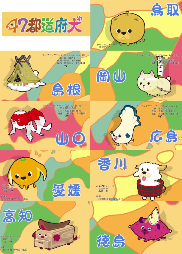 鳥取犬=梨 島根犬=出雲大社 岡山犬=きび団子 山口犬=金魚ちょうちん 広島犬=牡蠣 愛媛犬=いよかん(?) 香川犬=タライうどん 高知犬=かつお節 徳島犬=サツマイモ(鳴門金時)