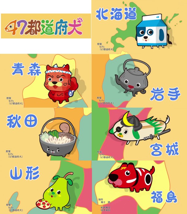 北海道犬=牛乳 青森犬=ねぶた 岩手犬=南部鉄器 秋田犬=きりたんぽ 宮城犬=笹かまぼこ(伊達政宗) 山形犬=ラフランス(花笠) 福島犬=赤べこ