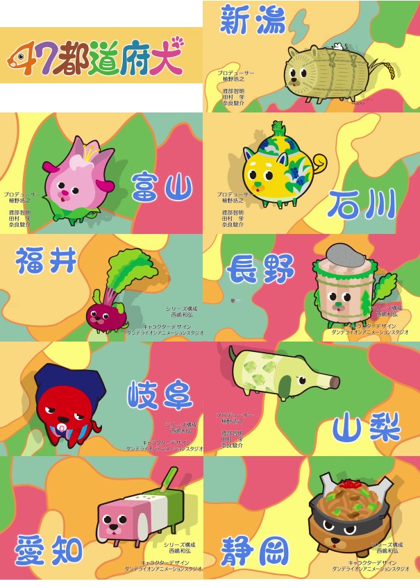 さて、放送1回目の雑感だが、一言で言うと「思ったよりも悪くない」。いくつか難点はあるが、あくまで慣れの問題だし、旧作とは別世界のものであるとしてはっきりと区別出来れば、これはこれで充分魅力的なものである。今作の知名度が上がることで、副次的に旧作のDVDなんかが売れればしめたものだ。出来ることなら、リンクを密にして旧作の宣伝もガンガンやって欲しいところなんですが……何故か作品間での繋がりが見られないんだよなぁ。製作元が違うのかなぁ。 先に、1話を見ての不満点を挙げておくと、当然のことながら「密度の薄さ」は気になるところ。旧作が1回につき30秒×2本というジェットコースター作品であり、わずか30秒の中で全てを賭けて輝きを放つ名古屋たちのおかげで奇跡的な完成度を誇っていたわけだが、今作は5分枠になり、オープンエンドが各1分、その間に1分のエピソードが3本収録される形だ。30秒も1分も大して変わらないだろ、と思われるかもしれないが、やはりスピード感、あの刹那的で殺伐とした空気は出ない。まー、考えてみれば旧作だって1話はそこまで暴れていたわけではないのだし、ここからどういう方向に作品が進行するのかはまだ未知数。がっかりするような段階じゃない。 逆に、注目すべき期待ポイントも見てみよう。何とも逆説的な話だが、やはり時間が伸びたことにより、尺に余裕が出来て色々な話が出来るようになったのは大きい。「1話で1県をフィーチャーする」という旧作の枠が無くなり、今作は自由に色々な県がコミュニケーションを取れるようになった。序盤は当然紹介エピソードに尺を使うだろうが、より日常的な空気が楽しめるようになったのは良い点だろう。ある程度ほのぼの路線でいくのなら、こういう賑々しい雰囲気も悪くない。また、最低限の使命は忘れていないようで、ちゃんと1話目からデストラクションは発生している。割れて、潰れて、食われてこその都道府犬。今後もどのようなジェノサイドが繰り広げられるか、楽しみである。懸念材料だった3D作画についても、割とクオリティが高いので可愛らしさは出ている。旧作が持っていた「キモ可愛い」路線とは違って純粋にかわいい系に移行したのは賛否あると思うが、まだまだここから怪しげな犬が待ち構えているので、怪しさは今後に期待しよう。 ちなみに、現時点で旧作との繋がりはオープニングテーマのみである。オープニングは、旧作PVで流れていたテーマソング「スウィンギンレビュー’47」のアレンジ、「Cartoon Swing’47」。残念ながらキャラが違うのでサビ部分の「食べたいなエビフライ」のあたりは無くなっているが、一応は旧作との接点であろう。また、オープニングは全ての県が一覧として登場しているので、旧作と違って最初から全ての県が明らかになっているのも特徴である。各県についてのまとめは追々作っていく予定だが、現在はとりあえず早見表をあげておく。