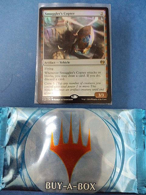 一週間のご無沙汰でしたが、復帰第一戦は残念ながら6人戦。まぁ、元々これが普通だったからね、ヘーキヘーキ。……待ち時間が長いお……。 今週は、特にお知らせもないのでどうでもいいエピソードを書いておくと、今週末からスタンダード・ショーダウンが始まりましたね。ちょっと気になるのでチャンスがあれば出たいな、って思ってたんだけど、何の準備もしてないので出られるわけもなく、代わりに「カラデシュを箱で買ったら同じ内容の特製パック2個プレゼント」っていうキャンペーンがあったので、1箱買ってパックを貰ってきました。そして、1パック目を開封してみての結果はこんな感じ。「膨らんだ意識曲げ」が出ました。まぁまぁ、これくらいなら多分悪くない結果でしょう。ただ、楽しみにしてたフォイル枠にコモンが入っていることが判明してだいぶがっかり。別にフォイルだからって価値が上がるわけでもなしなぁ。んで、続いてみんなの前で2パック目を開封。せっかくの記念品なのでカードを見ないようにパックを剥き、1枚ずつドラムロールと共にオープンしていくことに。で、その時に「じゃ、まずフォイルの枠が一番ショボいだろうから、真ん中のカードからオープンしよう」って言ったわけさ。ちゃんと経験から学習する俺、偉いよね。 で、その結果がこちら。 ………………センスないわー。俺パック剥くセンスないわー。後からめくられた「ボーマットの急使」さんがすげぇ出づらそうで本当に申し訳なかった。しかし、こんなんもらったらマジでショーダウン行きたくなるな……どうしようかな……。