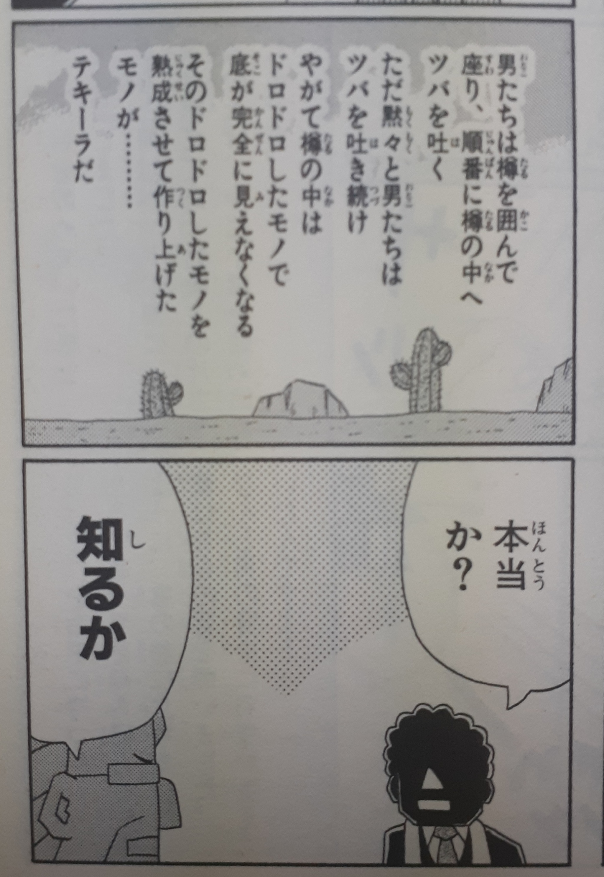 Round8・「てんがろー」 1、(ルー語)赤点。 2、メキシコの詩人。「絶えず男たちが酒樽につばを吐き続けたような」と評される、退廃的で嗜虐を極めた作風。作「メニー・エネミー」。 3、床を上げて、テントを張った小屋。 4、ジャングルジムやピラミッドパワー等の、天井が低い建物の総称。 5、美術品などを展示する小施設。展画廊の字を当てることも。 6、小型の虫かご。 7、江戸時代、当代の将軍から、家老の中で最も優れていると認められた10人の人物。 新明解から。みんなしてすでに疲弊していたためにかなりの長考になっている。 ①そんな中、ものの1分で提出された唯一の答えがこれだったらしい。「そりゃ、すぐに思いつくこれしかないでしょ」。 ②「何か隠れているのか?」と訝しまれた比喩表現の出典は施川ユウキの「頑張れ!酢めし疑獄」です。流石にネット上にも画像は無かったので、自前のコミックの画像あげときます(この一手間いるか?)。 ③「これ、どういう状況やねん? 小屋作ったのになんでテント?」などと存在が疑われたが、後で画像をググって「これかー!」ってなった。いや、小屋ってのは違くない?? ④はい、無事に次鋒まで出揃いましたね。いや、正確にはこれもう、プリズマンのことじゃなくてプリズマン戦全般のまとめだけど……。「ピラミッドパワー等」っていう説明に事情を知らない人たちは首を傾げていたけど、事情を知れば納得ですね。一応、私は「ピラミッドだけだと、ミスターカーメンと紛らわしいので」という補足をしましたが、作成者様のご意向に沿えたかどうかはわかりません。そして結局ここも落とし所は「天がLOW」なんだよな。 ⑤伸ばし棒だって何回も確認したのに……。「いや、もしかしたら知らない外国語でこういう表記なのかもしれませんよ」「確かにgarouもgarellyもなんとなく似てるしな」 ⑥「えーと、てんとう虫が……」「そんなに頑張ってやっちゃばらんでも」。これも結局LOWだったのかと思われたが、「籠」が正解でした。 ⑦だから伸ばし棒だって……。「知ってる家老って、田沼とか……」「いや、それ、老中でしょ。家老ってそれぞれの大名の家臣じゃないですか」「じゃぁ将軍がいちいち諸侯の家老について知ってるわけないじゃん」「なんか、そういう雑誌の特集とかがあるんじゃないですか? 『この家老がすごい!1612』みたいな」「割と早い時期だな……」。